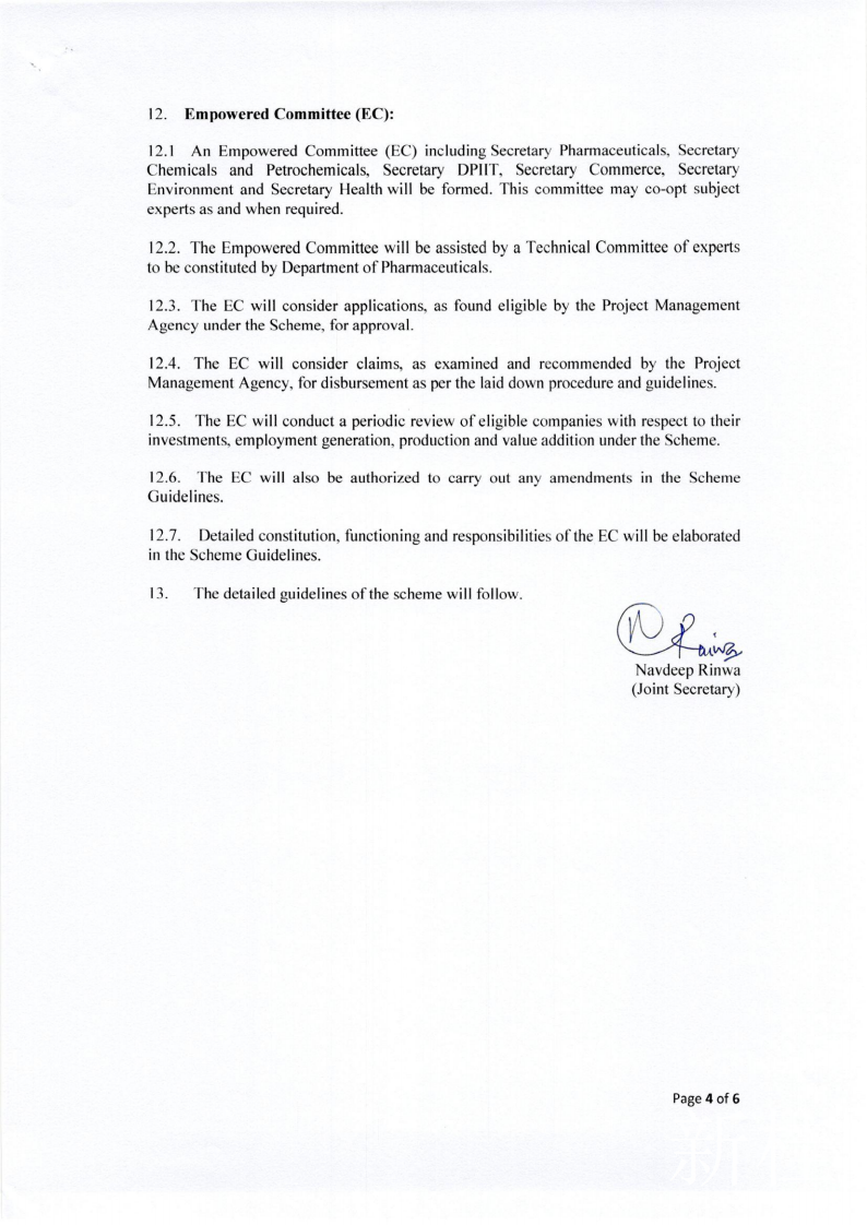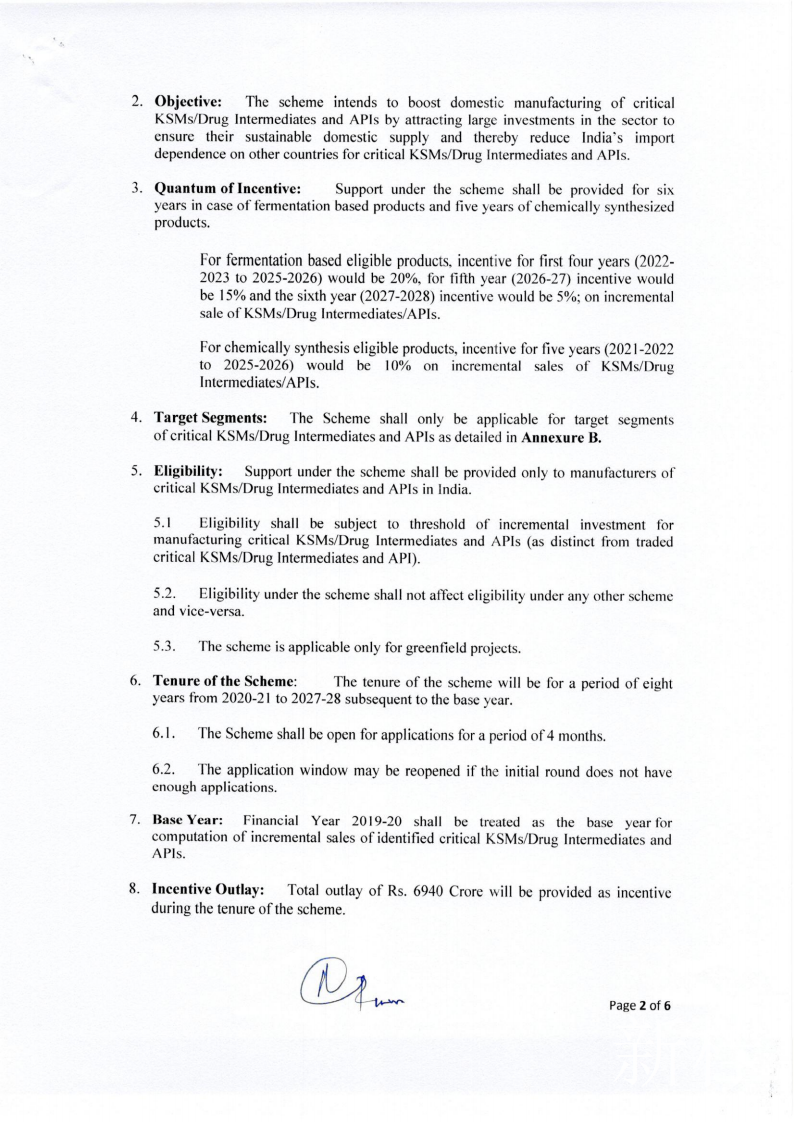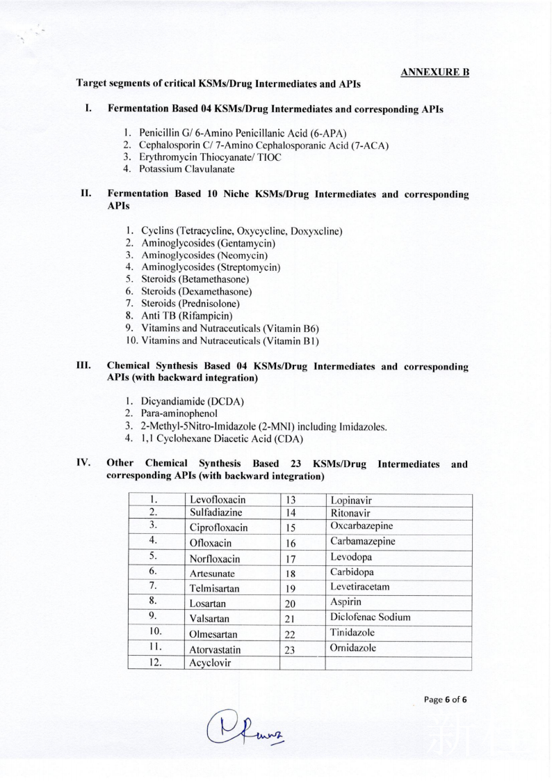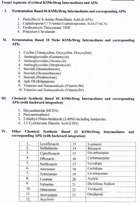 根据最终指导方针,该计划可能会将制药业分为四个部分。第一部分涉及“四种基于发酵的关键起始原料(key starting materials, KSM) 产品”的生产,这些产品用于制造最畅销的抗生素,包括青霉素和克拉维酸。将选出八名受益人,总激励额为360亿卢比,对每位参与者奖励20%。 第二部分涉及“ 10种基于发酵的利基(补缺)KSM和API产品”,包括新霉素,庆大霉素,维生素B1,四环素,强力霉素和倍他米松。在这里,将选择20个受益人,以获得价值100亿卢比的奖励,每位参与者的奖励总额为20%。在第三部分中,“ 4种基于化学合成的KSM或API产品”吸引了960千万卢比的奖励,每种奖励将分别给予10%的奖励。最后一部分将吸引138亿卢比的奖励用于“ 23种基于化学合成的KSM和API产品”,包括心血管用药缬沙坦,阿托伐他汀,氧氟沙星抗生素,抗HIV药物利托那韦和洛匹那韦,维生素B6和阿司匹林。每位玩家将获得10%的奖励。政府还将根据该计划宣布每个参与者的强制性最低产能。例如,青霉素的最小生产能力为5,000吨,而克拉维酸的最小生产能力为15万公斤。从发布通知之日到发出邀请的申请,至少需要155天(五个月)才能获得批准,根据该计划进行注册并开始生产。