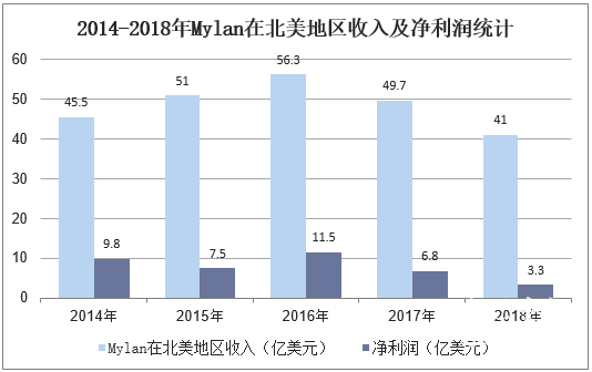 不仅仅是TEVA,从Mylan的财报中也可以看出其美国仿制药业务近年来开始承受到较大的业绩压力。2017、2018年Mylan在北美地区收入和利润连续两年呈现下滑态势。2018年Mylan在北美洲营收41亿美元,净利润3.3亿美元。