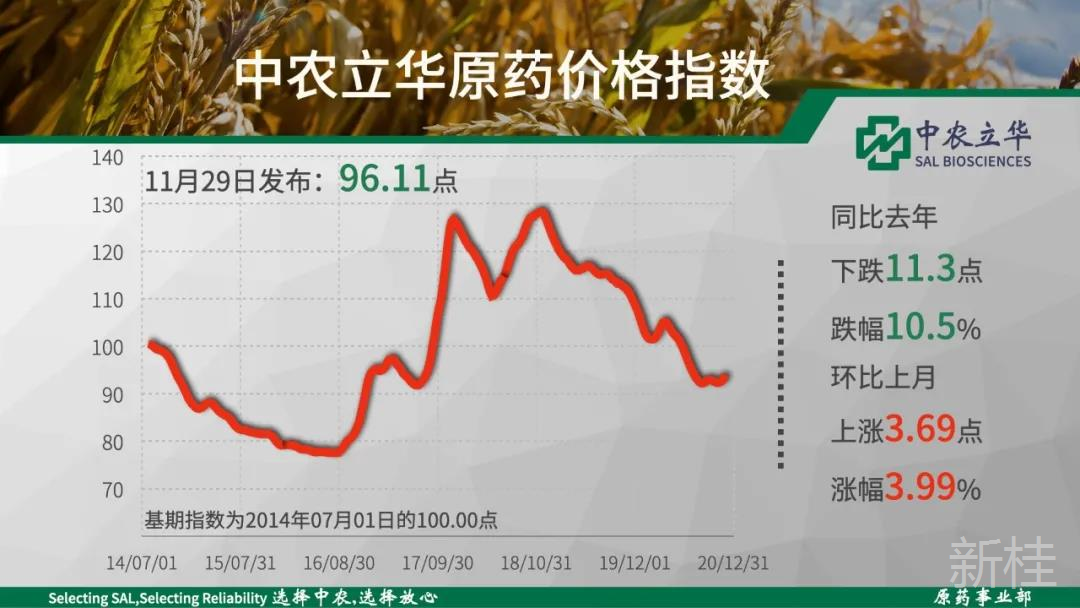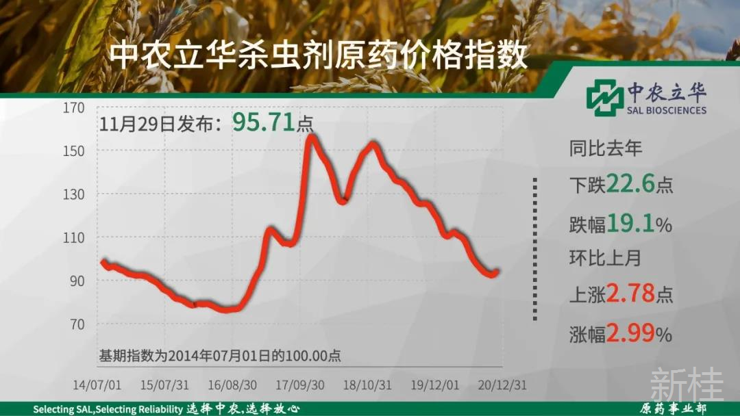 2020年11月29日中农立华杀虫剂原药价格指数报95.71点,同比去年大幅下跌19.1%,但受基础原材料上涨的影响,烟碱类产品为代表的产品触底反弹,吡蚜酮原药(8.8%)、吡虫啉原药(8.7%)、噻虫嗪原药(6.5%)等上涨超过5%,指数环比上月上涨3.0%。