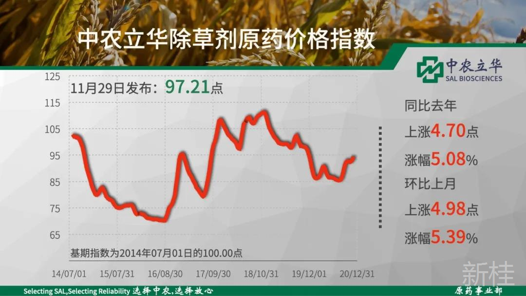 2020年11月29日中农立华除草剂原药价格指数报97.21点,环比上月大涨5.4%,莠去津原药(11.8%)、草铵膦原药(6.2%)、草甘膦原药(6.1%)、丙草胺原药(6.1%)、丁草胺原药5.3%)大幅上涨超5%。
