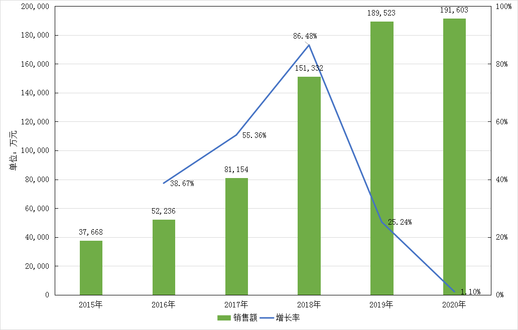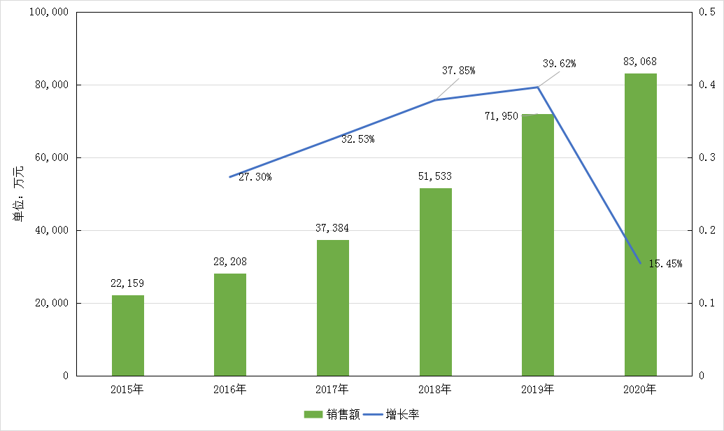 图6 2015-2020年我国公立医疗机构苯溴马隆销售额和增长率