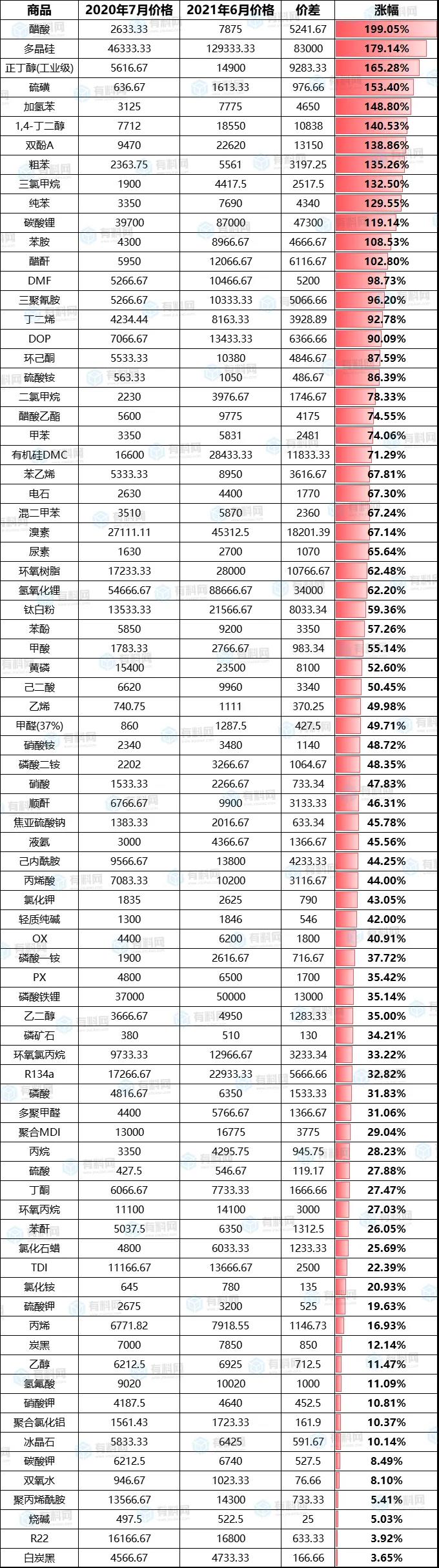 2020年下半年至今部分化工原材料价格变动表