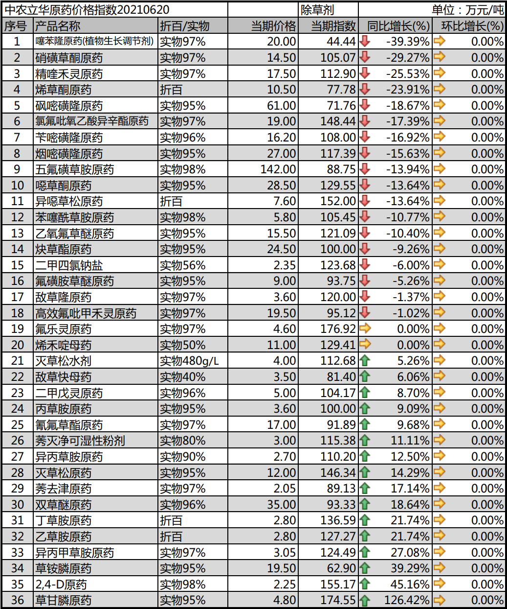 除草剂进入传统用药淡季,需求开始回落,但灭生性除草剂均大幅上涨。2021年06月20日中农立华除草剂原药价格指数报154.95点,其中草甘膦原药继续暴涨,创出近十年历史新高。