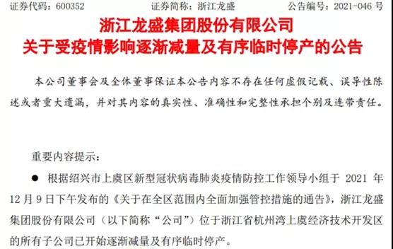 皇马科技则表示,公司下属全资子公司浙江绿科安化学有限公司、浙江皇马尚宜新材料有限公司受疫情影响于12月9日下午起开始逐渐减量及有序临时停产;公司产品均由上述两家全资子公司生产,占公司的全部产能。