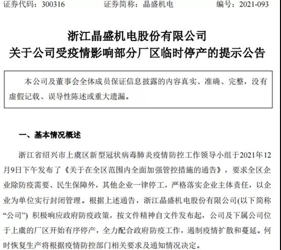 受浙江疫情防控影响,12月12日晚间,晶盛机电、锋龙股份、中欣氟材、春晖智控、家联科技、金盾股份、阳光照明7家上市公司发布临时停产公告,加上此前已发布临时停产公告的贝斯美、浙江龙盛、皇马科技、药石科技、扬帆新材、争光股份6家上市公司,目前共有13家上市公司发布临时停产公告。