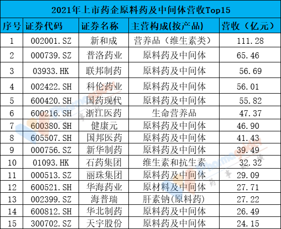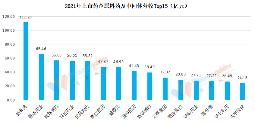 总的来说,前5名公司的原料药及中间体业务营收都在50亿元以上,top15的营收都在20亿元以上。
