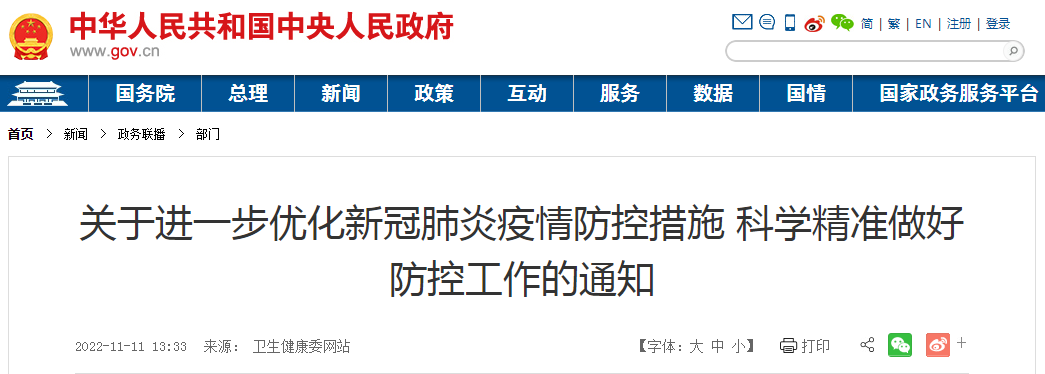 11月11日,国务院应对新型冠状病毒肺炎疫情联防联控机制综合组发布了《关于进一步优化新冠肺炎疫情防控措施,科学精准做好防控工作的通知》。