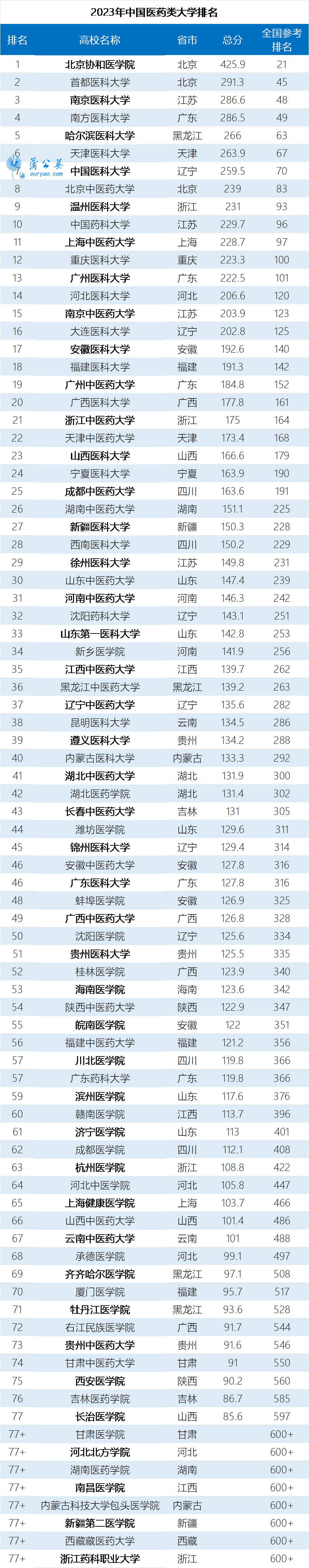 中国药科大学位列第10名,比2022年上升了1位,沈阳药科大学位列第32名,比2022年排名下降了8位。