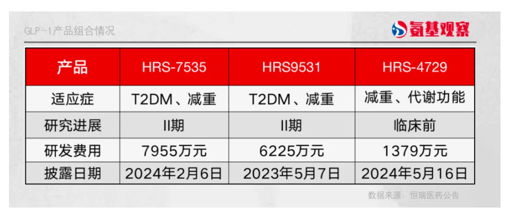 Hercules看中的三款产品,分别是口服小分子GLP-1受体激动剂HRS-7535,GLP-1/GIP双受体激动剂多肽注射和口服产品HRS9531以及下一代肠促胰岛素产品HRS-4729。其中,HRS-7535、HRS9531处于临床II期,HRS-4729则处于临床前研究。