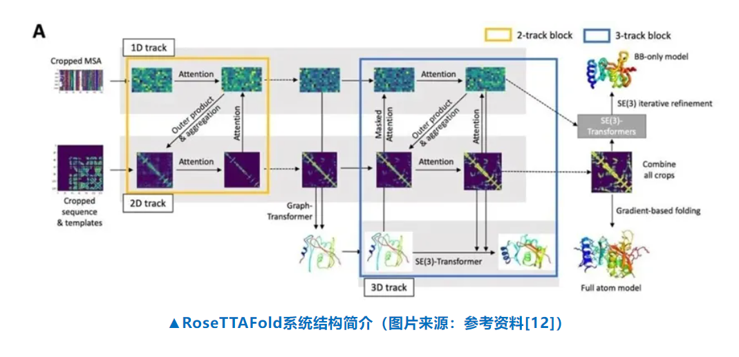 RoseTTAFold的神经网络能够同时考虑蛋白序列的模式、蛋白中不同氨基酸之间的相互作用,以及蛋白质可能出现的3D结构。在这个系统中,一维、二维和三维的信息能够相互交流,让神经网络综合所有信息,决定蛋白质的化学组成部分和它折叠产生的结构之间的关系。